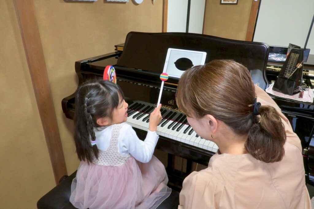 子どもレッスンでは、リトミック要素を取り入れたピアノレッスンを行い、小物楽器やおんぷカードなど五感を刺激するグッズを活用しています。